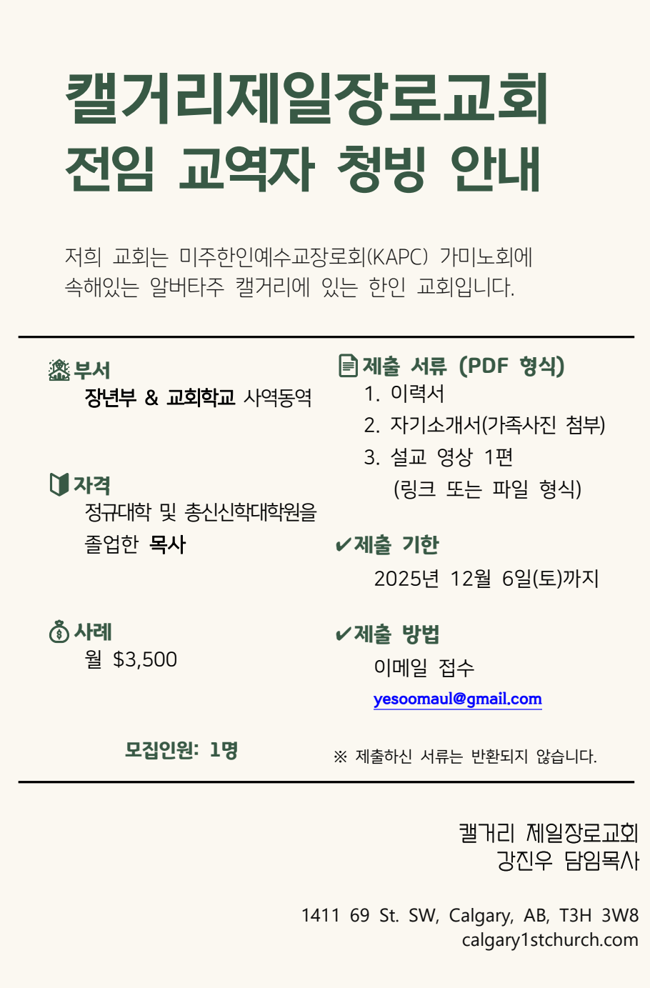 캐나다 캘거리 제일장로교회에서 전임 교역자를 찾습니다.